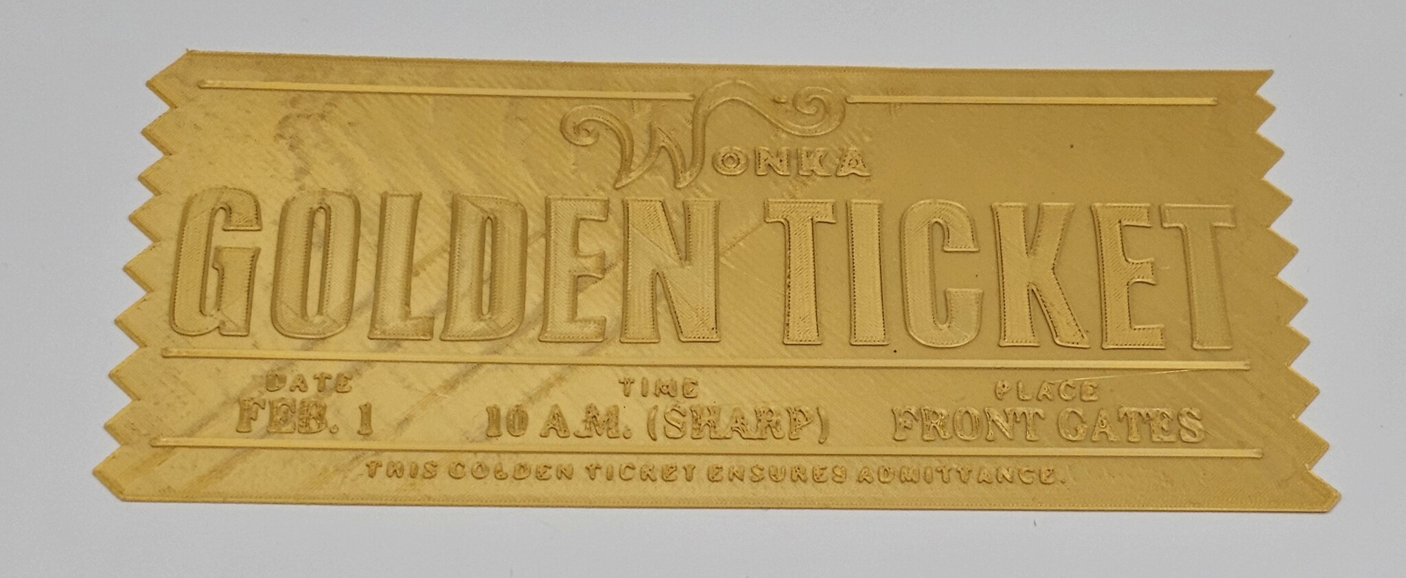 Step into a world of pure imagination with this 3D-printed Willy Wonka Golden Ticket! Inspired by the iconic film, this highly detailed replica is perfect for collectors, cosplay, or as a unique gift for any fan. Made from high-quality, durable material, the ticket features embossed lettering and an authentic design that brings the magic of Wonka’s chocolate factory to life. Whether displayed as a keepsake or used for themed events, this golden ticket is a must-have for any Willy Wonka enthusiast!